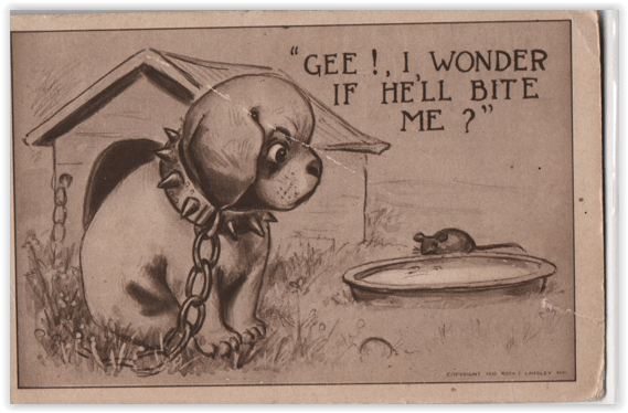 Cute puppies abounded on postcard racks throughout the nation, possibly more even than the omnipresent Dutch kids. This artist, whom I call “Black Box” always has HIS puppy speaking in a well-defined box somewhere in the corner. (There was another artist of this time who seems to have specialized in dogs wearing muzzles, but we can save that for another day.)