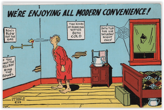 And it’s not so much that a hotel is BAD, necessarily, as that your expectations are too high. Sometimes a hotel visitor can be completely unreasonable. Take the refined gent in the postcard at the top here. If that towel was clean enough for the last two dozen men who used it, why should HE complain? He expects too much.