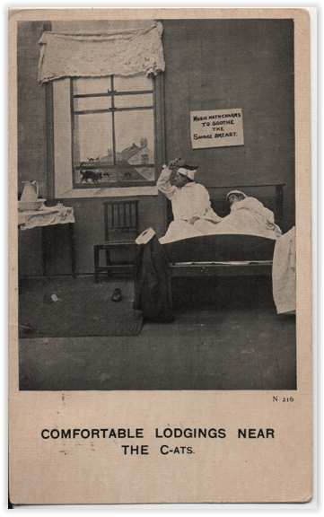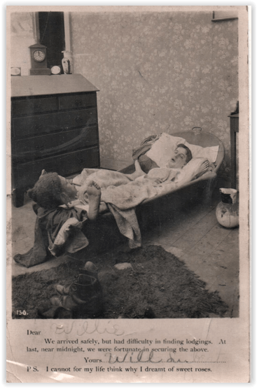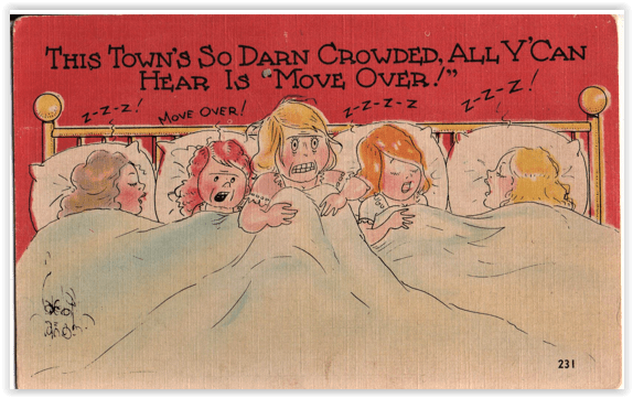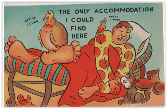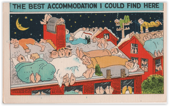 One of the most common complaints, especially at really popular places (and particularly true in the cities during World War II) was that the hotels were fully booked, and there wasn’t much space. Dozens of postcards complain about this, and yet the people shown could generally find a place, even if it was only semi-private sometimes.