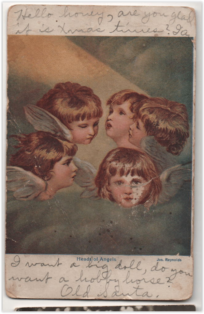 There are two possible candidates, and it all depends on when this card was sent. People did not stop using undivided back cards in 1907, when the divided ones became legal. He may have really liked this collection of heads by Sir Joshua Reynolds and put in a supply of them. Or he may have sent this around 1901 (dang that missing postmark.) Gage had four children, none of them named Lyman. But one of his grandsons was Lyman J. Gage II, born in 1896. If Old Santa wrote and addressed this card to Master Lyman when he was five or six, that fits in nicely. There WAS another Lyman J. Gage, born somewhere during the 1910s, the result of OUR Lyman marrying his third wife, Frances (known universally as Gloria). IF our Lyman saved these angel head postcards long enough….