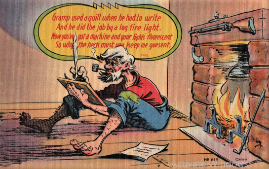 Ethnic mockery was toned down as the twentieth century went on, but it was still going strong when, in the 1930s, possibly in response to popular novels, a whole new ethnic group sprang into view and Hillbilly Humor took the nation by storm. Numerous artists took it up, including artist Luther Landis Irby, who is responsible for the card at the top of this column as well as dozens of others. Many of these, like the following, took up the age-old question of wondering why you were taking so long to write.