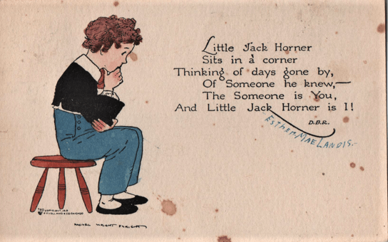 Other artists took their cue from nursery rhymes for their combination of longing and demand. (This is illustrator Mabel Wright Enright putting Little Jack Horner to work. Did he EVER stand up?)