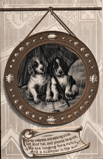 Of course, there was always a market for postcards with verses which were simply cute. Here, for your delectation, are some puppies, who seem Does it matter that the poem isn’t terribly coherent? Never!