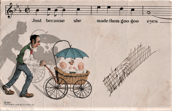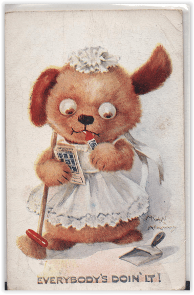 This refers to Irving Berlin’s oh, second or third smash hit. Not only was this song played everywhere, but the line “Everybody’s Doin’ It” could be used in dozens of postcard situations, from people scratching mosquito bites to downing a beer at the bar to, well, about anything. Look closely and you’ll see this card from the 1910s combines that craze with another: the British housewife dog is pasting trading stamps in a folder.
