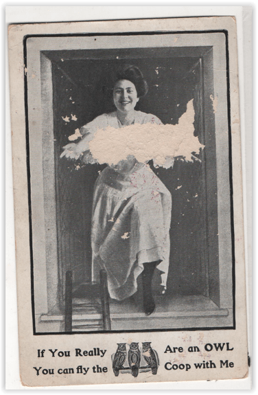 If you look closely at this damaged postcard, you will note the owls at the bottom have the same letter on their backs. This is because THIS card is for members of the Order Of Owls, which valued its secrecy a little more than the UCT boys. This group started just after the twentieth century began, and was intended to promote friendship and good deeds among businessmen. They were not too serious to make a joke like this one, and like a lot of these organizations did sell club pins, which would sort of seem to make things less secret. Still, there was no harm in letting people know you were a member of the O.O.O.; you just didn’t have to tell them what it meant.