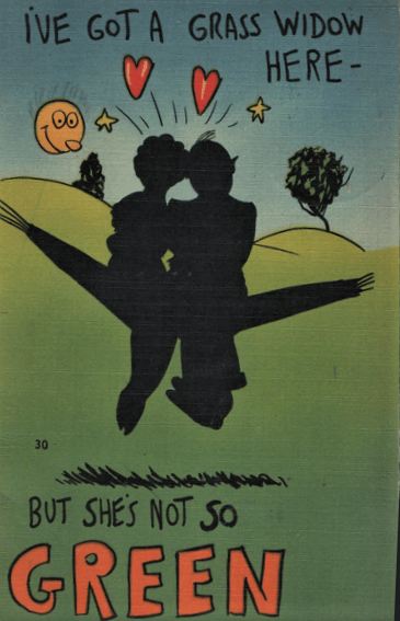 Take the couple at the top of this column, secure in silhouette on a modest hammock. Being told that a grass widow isn’t green lets us know that this is the wife of somebody who is far away, and she knows what she’s getting into when she gets into a hammock