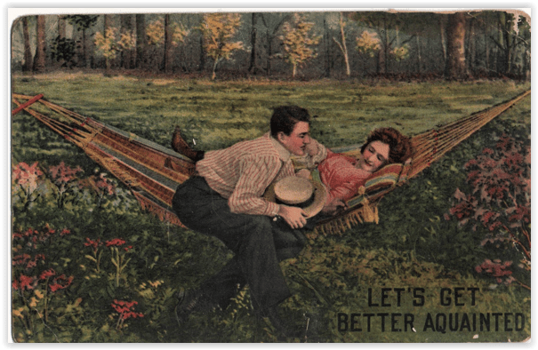 Well, we are well into summer now, so I suppose this would be a good time to discuss hammocks. Hammocks have a role of their own to play in the postcard world. Despite the occasional reference to hammocks used by those who go down to the sea in ships, and the occasional vacationer beset my mosquitoes while sitting in a hammock, hammocks were for lovers. And by that, I do not mean people who wanted to sit next to each other and hold hands.