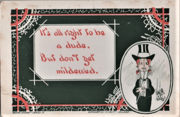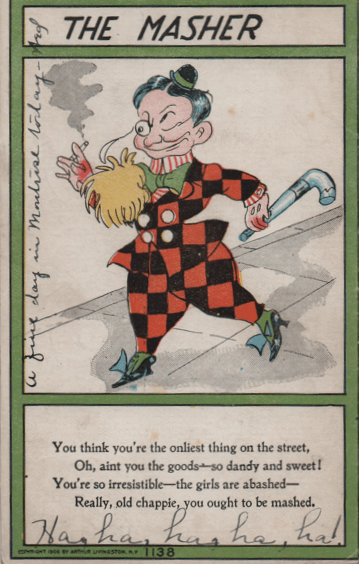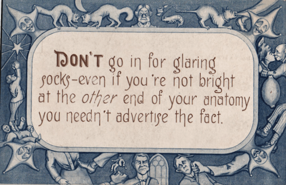 Postcard cartoonists in days of yore held strong opinions, or anyway expressed strong opinions, about clothes. They were cartoonists, after all, and whether clothes make the man or vice versa, they found clothes a very easy way to establish character. The way a character was clothed told you what the cartoonist wanted you to think about him. We are, as I think I have hinted in those last few sentences, going to look at how men dressed in postcards, as women’s dress had to carry a variety of messages, from what the cartoonist thought of some new fashion to whether we were expected to take the postcard home and pin it up somewhere the ladies of the house wouldn’t look