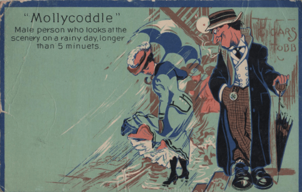 The artist of the Mollycoddle series could have indulged in worse name-calling than that, but preferred to express opinions through wardrobe. The central figure here is wearing a gaudy striped sweater with spotless white pants (known universally as “white ducks”), the marks of a weekend athlete, if that. (Striped sweaters were fabored by muscular members of college football teams—in pre-uniform, pre=helmet days—and he’s not exactly showing off a football physique.) And any sport you could indulge in while wearing heels that high was not considered much of a sport.