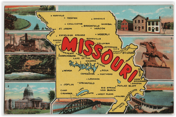 Here is another ho-hum type of postcard: the state map surrounded by tourist attractions. These used to be valued by grader school geography teachers: an inexpensive, graphic way to show a state’s individuality. Fifty of these—wait, maybe forty-eight for some of us—would make kids remember SOMETHING at least from geography class. This one has the added attraction of a small hand-drawn X, probably at the spot where the sender bought the card. What fun! Let’s flip it over and see if it tells us what these tourist stops in Missouri are.