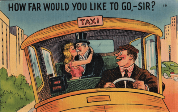 Naughty minds are not purely mid-century, by the way. This image dates to about 1906, and the postcard buyer of that distant day knew very well what the cartoonist—and the couple shown in high-society motoring outfits—was driving at.