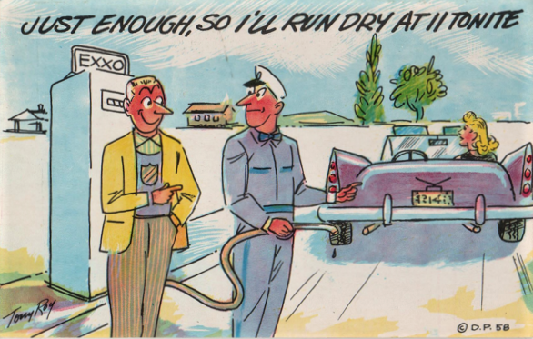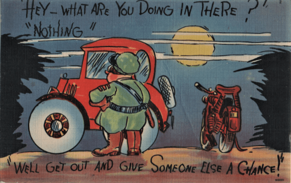 That’s the key to postcard humor, of course. (Any other oldtimers around there remember when cars had keys?) if you wanted that postcard to sell out in the open, where everyone could see it, you could not come right out and SHOW what was going on in the automobile. One had to assume one’s readers would have naughty enough minds to understand why, for example, this man is planning to run out of gas.