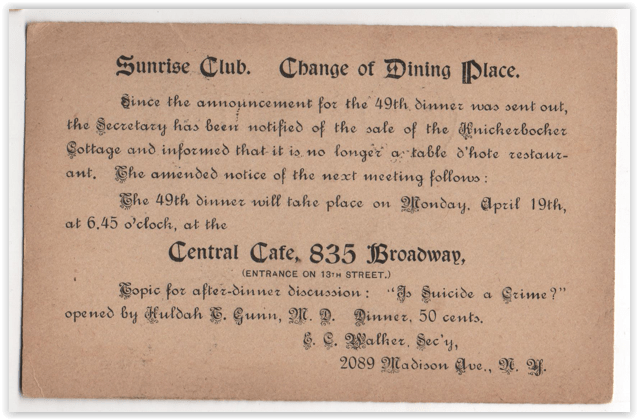 I have been able to learn nothing about the Sunrise Club, but the place it met was used for that purpose by many clubs, including the famous Turtle Club, which annually elected its president by a method which would NOT go over today. The Turtle Club served bowls of very rich turtle soup at its dinners. Whoever could consume the most bowls of this soup and still walk around the dining room became the president. (Lawsuits would put the club AND the meeting place out of business in one year these days.)