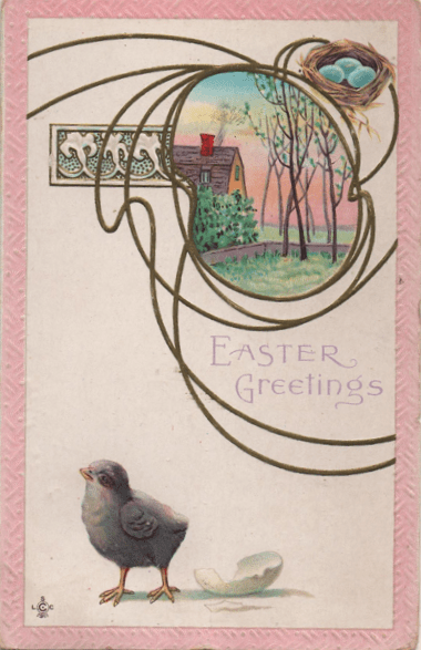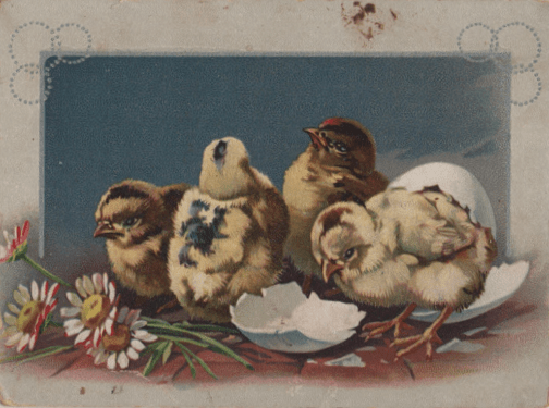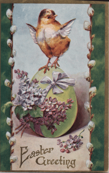 Some postcard artists simply plunk a chick down in the middle of everything else. This distinguishes the Easter cards from all the other cards they do with pretty flowers all over the place. (“Well, this is a little roomier than my last egg. Nice view from the window. But who are all these people looking at me?”)