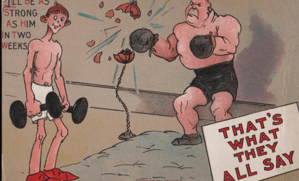 Where all such home remedies wind up making their money is on the optimist, the person who believes that one or two doses of vitamins or a couple of trips to the gym would work miracles. And the cartoonists made their money by pointing out the gap between expectation and reality. This card dates from 1911 or thereabouts, and shows us that we haven’t changed all that much.