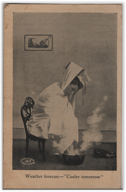 Cold? Sore throat? The man at the top of this column is making use of several traditional remedies–the foot bath, the flannel around the neck—but below is someone going full into cold prevention, with ice on his head to keep the fever down, a blanket around the shoulders, the steaming footbath…and the caption lets us know whether he can really hold off the inevitable.