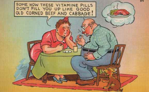 If your cure wasn’t a change in diet, it might be plain dieting. This card combines the idea with dieting and a mid-century fascination with the emerging science of vitamins for a science fictiony look at an era when food itself would be obsolete.