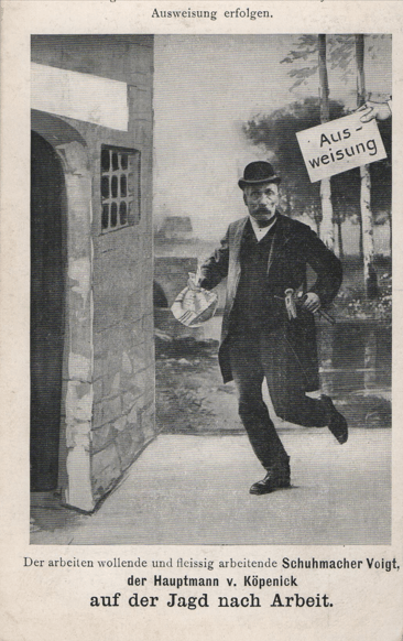 This man was famous for running, and for selling postcards of himself. Wilhelm Voigt was a shoemaker, but did a little thieving as a sideline, and found himself disliked by the police wherever he went. In 1906, wearing various secondhand bits of uniform he’d bought secondhand, he traveled to the town of Kopenick, started giving orders (which were obeyed, since he had a uniform on) and ended by ordering the arrest of the mayor and the town treasurer, confiscating the town treasury for investigative purposes. He was even more unpopular with the authorities now, but by the time they caught him, the story had traveled fast and far even without Interwebs, and everyone was laughing. As the Hauptmann von Kopenick (Captain from Kopenick) he went on the lecture tour, sold postcards of himself, and just became a symbol of what some people will do when they see a man in uniform. He became a national folk hero, with countless movie and comic book versions of the story. This is the man himself, acting out part of HIS version of the story (in which he claimed he had no IDEA what people would do when he bought an old uniform just to keep warm.)