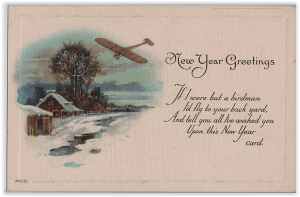 This cozy aerial view comes with no date at all, but the style of that airplane puts it somewhere in the zeroes or tens of the last century. I wonder if the folks snowed into the farmhouse were expecting company, or resented the intrusion of engine sounds on their silent night.