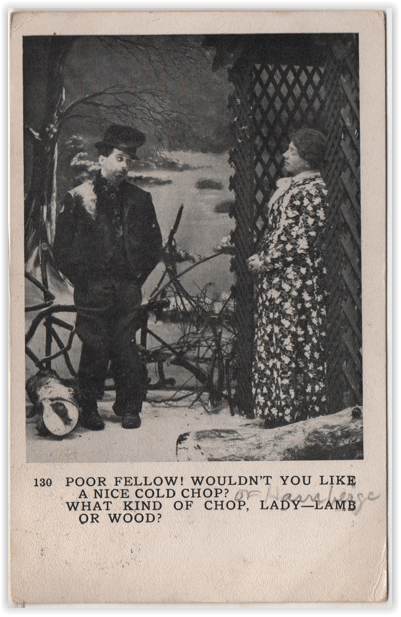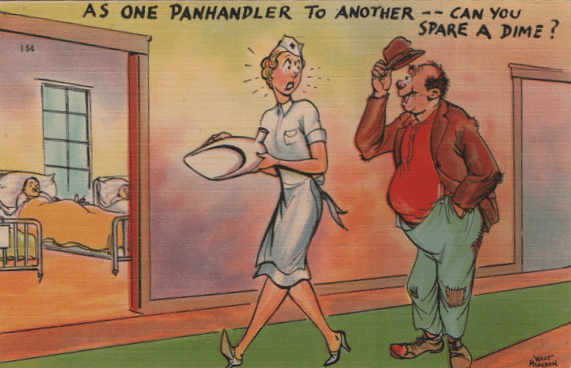 Of course, we all have our ways of dealing with panhandlers. One of my friends would always refuse politely when asked for money on the street, but would frequently mutter “Why doesn’t he get a job?” as he moved on. (Yes, I am the one who would point out “He does have a job. That’s it.”) Those who are interested in telling us what to say carry this to another level, reminding us that neither “beggar” no “panhandler” are complimentary terms, and should not be used, as these people have their own troubles and should not be loaded down with the weight of unpleasant labels. I don’t know how they would have felt about my use of “mendicant”, which is more properly applied to those members of mendicant religious orders. I could look it up, I suppose, but there’s no money in that. Anyhow, our postcard publishers didn’t mind kindness to a panhandler, especially if a pun was made available thereby.