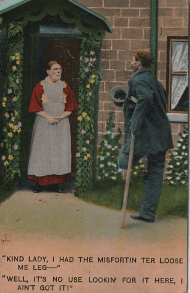 The postcard makers were divided into the same two classes we have today. We have those who admired a panhandler who was as shameless as this chap asking for a minor bit of sewing. (I have always had a soft spot in my heart for the panhandler I was passing with a nod but no donation who shouted after me “I’ll tell your mother!”)