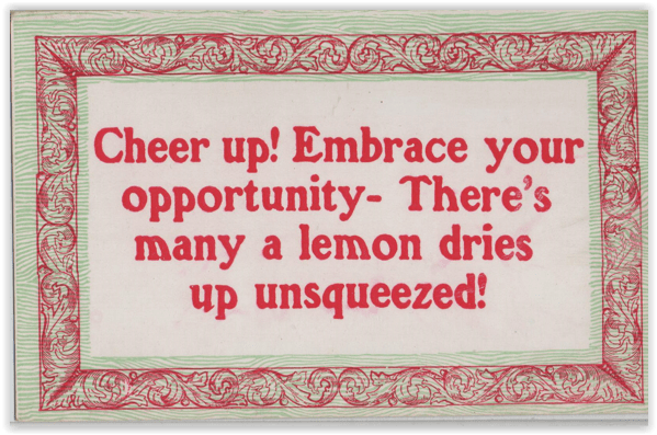 Some of the advice I find on elderly postcards strikes me as dubious, though it may work perfectly well for the right person at the right time. I have been working on the aphorism at the top of this column for quite some time, and I have come out where I went in. I THINK I know what this postcard is getting at, but I can’t quite figure out the analogy. I’m thinking of lemons when I should be thinking of the life lesson I’m being offered.