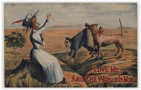 Some time ago, we examined postcards featuring dogs and found that the number one thing our canine friends do in comic postcards is, well, number one. The number of postcards involving peeing pekes and poodles was so vast that there was an equal and opposite number of postcards featuring dogs who weren’t urinating just when you expected them to. (The whole series of dialogues between trees and passing pooches is worthy of a blog on its own.)