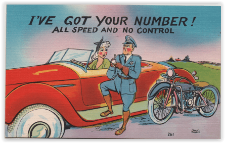 After the war, of course, that old streamlined look seemed too decade-specific. Car designers started to look at the straight line again, breaking up the curves, prompted, according to some critics, by the resemblance of 1930s automobiles to helmets, which were an unpleasant reminder. At the same time, the postcard was moving into its last days as a major tool of cartoon humor