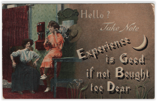 See, I was looking at all these telephone postcards headed with “Hello”, and knowing the fine old story about Alexander Graham Bell…no, not the one about shouting to Mr. Watson and realizing his invention worked. The one about how Bell felt his invention ought to be used. All his life, I am told, he answered the telephone with “Ahoy!” The word, I am told, dropped from common usage for a while, but was revived when more and more people took up sailing as a pastime. Bell was also known for his nautical interests, so it was a natural usage. (Later in life, he worked on hydrofoil vessels and for a while operated the world’s fastest boat. The telephone was not his WHOLE life.)