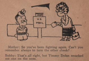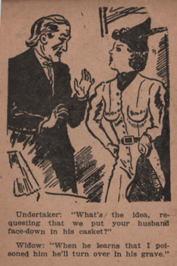 In format, they resemble the eight-page narratives I have discussed in this space, but these are NOT pornographic, and they come with twelve pages each.. Each page contains a different joke with an accompanying illustration, so you were not getting a LOT of jokes when you picked these up. They are the work of Ceagee Publishing a company which, um, I cannot find listed anywhere on the Interwebs. It may have been one person with a stencil machine and a mind for telling jokes. They all date from 1944, so it may have been a G.I. with an office job and time on his hands