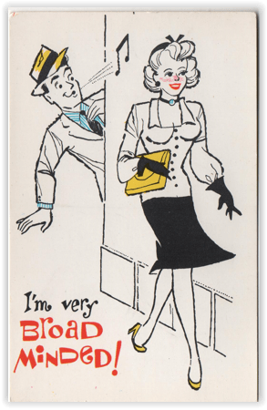 Our postcard artists were, by the way, not the least bit shy about allowing the woman to apply the pick-up line. I have mentioned in this space before an acquaintance of mine who was a dedicated manhunter.
