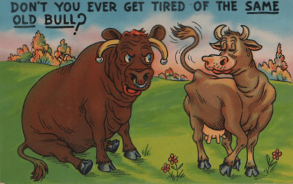 This suggestion is very popular among cows (on postcards, anyhow.) It would simply confuse other prospects, which is not always, despite the previous example, a good thing. One of the least successful pick-up lines I can recall was used by an extremely attractive young lady, who had read that the best way to start was with an inquiry about food, since, as the experts note “we all eat.” So she used to begin with a possible young man by asking “Do you like cheese?” Ensuing conversations did not continue very long.