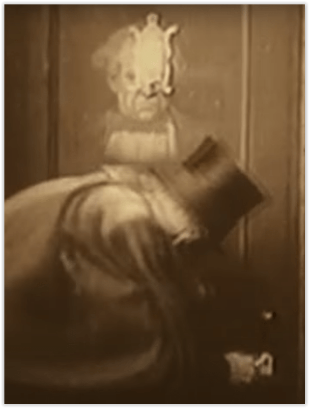 Finney enters a lonely quarter and walks up to a door with a blackened metal lion doorknocker wearing quite as nasty an expression as Scrooge himself. While Scrooge has his key in the lock, he looks up to see the lion change into the face of his late partner. Its eyes open slowly, and it says “Scrooge” before becoming a lion again. Scrooge goes inside, several times looking back at the knocker and checking the back of the door. Finally, he declares “Humbug!”