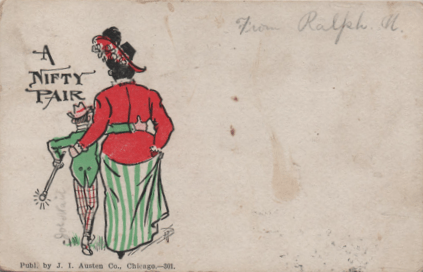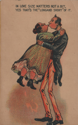 “The long and short of it” was a frequent fallback in any picture of contrasts between the heights in a picture, but this puts it all more romantically. This image was popular, and appears on a number of cards with only slight differences in the coloring of the complexions and wardrobes (though the lady always has those stripey socks.)