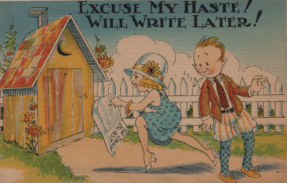 One writer who is probably on the right track says we simply got used to seeing the crescent moon in cartoons and postcards, and THAT’S how it became traditional. He kind of slips off the rails when he points out that comic postcards of the 1930s and 1940s NEVER show crescent moons on outhouses, so obviously it’s a post-war convention. (By the way, a couple of the postcards shown here are from the 1940s and I’m pretty sure that young lady in a hurry dates to the 1930s.)