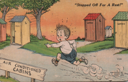 Some other time, we shall discuss the weighty question of why our ancestors had so many jokes about bathrooms and their functions and the functions of people using them in their world of postcards. It could be because postcards were consider such a quick, informal form of communication that we could toss in a quick bathroom joke and no one would care. Or it may be that, as the twentieth century went on, postcards became associated with vacations and leisure time, and one could have a more relaxed attitude to humor. Or it may be, as discussed in a previous column, that people encountered outhouses more while on vacation (they were a fixture, apparently, in trailer parks before the Fifties or thereabouts).