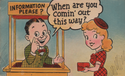 Some of the background will not materially affect your appreciation of the joke. The postcard at the top of today’s adventure is perfectly comprehensible even if you don’t know that once upon a time you had to get someone’s phone number by calling the operator and requesting “Information, please”. This phrase in turn became the name of a wildly popular game show where the audience would send in trivia questions in hopes of bewildering a panel of experts, who acquired a reputation for omniscience. Guest panelists, I am told, included Dorothy parker and Boris Karloff, which provokes all sorts of questions I’d like more information about.