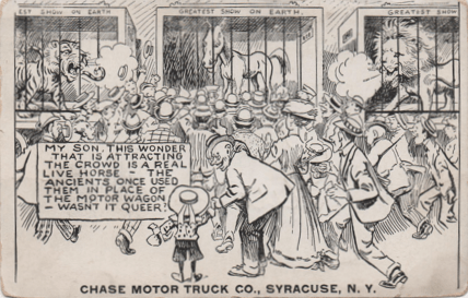 This gag was omnipresent in the first generation after the invention of the automobile, and is not necessarily enhanced by knowing that the truck company that put it out was a leader in inventing multi-purpose vehicles: cars, for example, which could be converted into trucks, ad is now considered one of the rarest of American motor companies as, despite having produced vehicles for over a decade, only forty or fifty of these still exist. Horses are still in the majority.