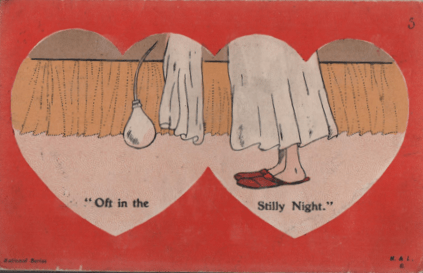 This gag, besides expecting you to be familiar with the song known by this title, relies on you understanding that this is a parent feeding a baby in the middle of the night. Few of us now dress our tots in these long nightgowns, and this particular design of baby bottle disappeared long ago. I am tired of seeing listings of postcards which describe this as enema equipment. The baby bottle once operated on a similar principle: if you get the liquid running fast enough down the tube and aim it at the sweet spot at the back of the throat, Baby will have to swallow what’s coming down whether it’s apple juice or rhubarb extract. Of course, if you miss that spot, you’re going to have a choking, irritated infant, and…yeah, we gave up on that technology.
