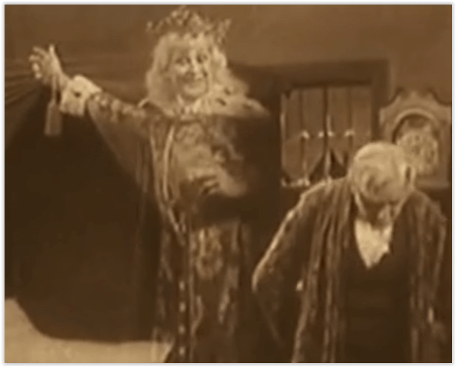 Finney gets a very solid=looking matron in a fashionable red dress and very expensive hat. Her earrings glitter, and she wears a black choker. Hands clad in white gloves reside within a fur muff. She is very sure of herself, and obviously intends to take no nonsense from any Ebenezer Scrooge.