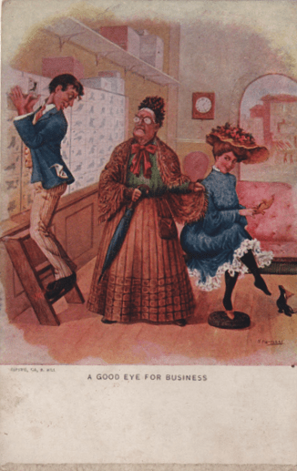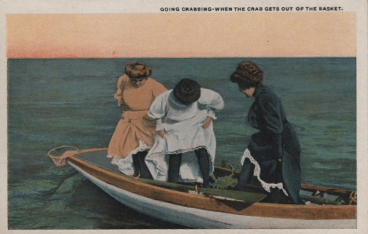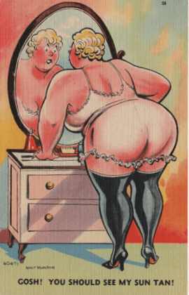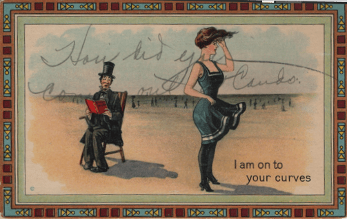 Maybe I’m not seeing the line between staring at women’s legs and staring at their stockings is drawn. Our postcard cartoonists, though, knew where to draw that line.