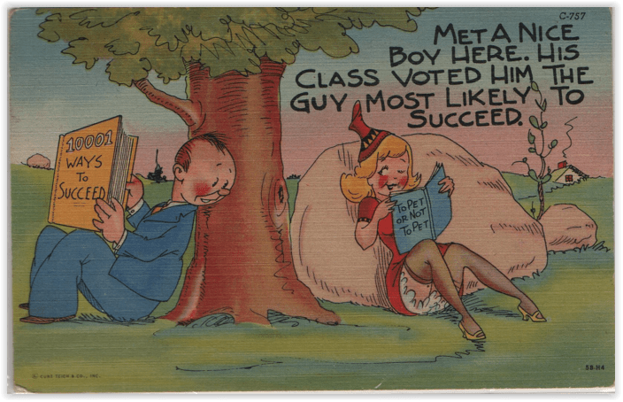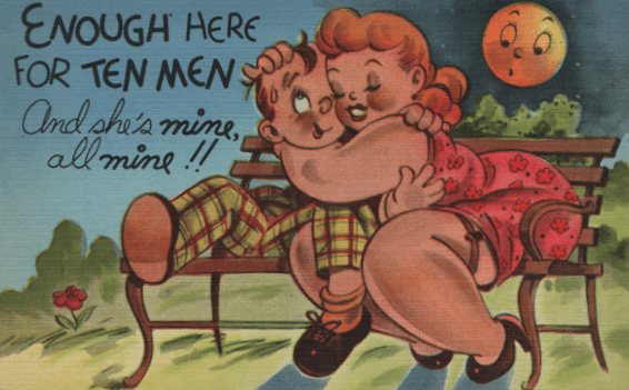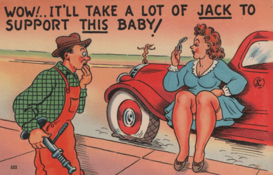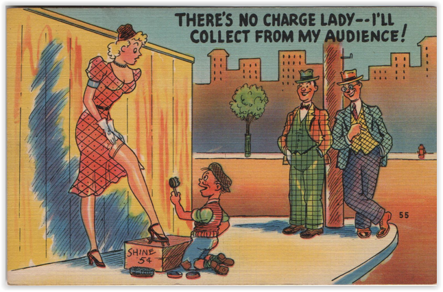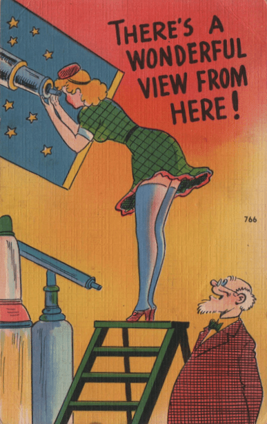 The cartoonists, at least the ones included in my inventory, did not include EVERY feature of the stocking which attracted viewers of the day. This, for example, is the only card I’ve noticed which emphasizes the seam at the back of the stocking (memorialized by songwriters and comedians in days of yore; these replaced the jokes about the “clocks” on pre-nylon stockings, which on postcards frequently have mice trying to run up them. This seam was already important enough by World War II that when nylons were rationed, and some companies sold a nylon-colored leg paint to take their place, women were urged to take an eyebrow pencil and draw in the seam, which no doubt resulted in a lot of improbable seam work until the skill could be mastered.)