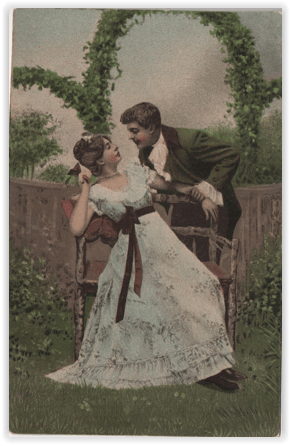 We have, hereintofore, considered the various locales favored y our ancestors at the turn of the last century when it came to romance. The people passing through the years 1900-1920 hand-in-hand (lip-to-lip, perhaps, but that’s really as far as the mails would let ‘em go) have been shown to enjoy the comforts of benches, hammocks, haystacks, and the back seats of primitive automobiles. But we must not ignore their choices in landscaping.