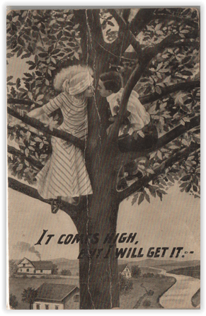 Some people, of a more adventurous nature, seem to have favored trees. These provided a spot less likely to be found by passing wildlife, and, in the right season, offered plenty of cover. Certain hazards accompanied this sort of spooning spot, but, as this caption notes, the higher up the fruit grows, the sweeter it is.
