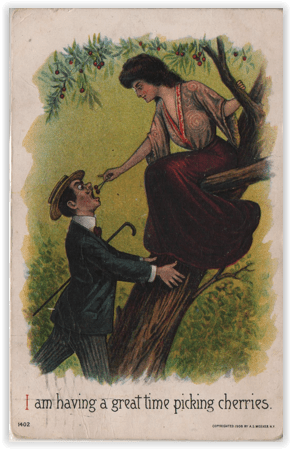 Which is, I am certain, the only message communicated by this…I wonder who’s supposed to be speaking here. I mean, if he’s the one…but he wouldn’t say anything like that on a postcard. Anyway, she’s the picking cherries, of course, and the one offering the man…we’ll just move along, shall we?