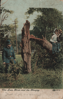 The tree also offered refuge to lovers in public parks, where the police patrolled to make sure no courting couples went beyond the bounds of decency. (Public kissing was actually banned in a number of communities.) This couple found a slightly elevated bench without having to climb a whole tree, though it has not saved them from the watchful eye of the law.