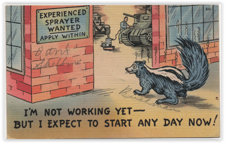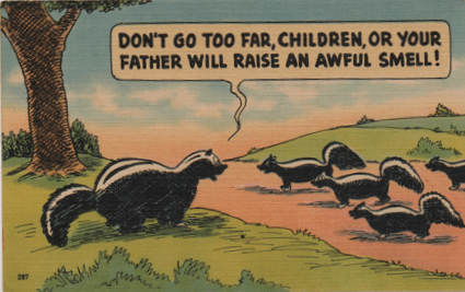 The skunk, I am told here, is a member of the weasel family, which may come in brown, ginger, or cream colors as well as black, almost always have stripes or other warning marks, and almost never, ever bite. This is all very well for science on the Interwebs. In postcards (as well as other media), they are black and white animals that smell bad, and are fairly amused to do so.