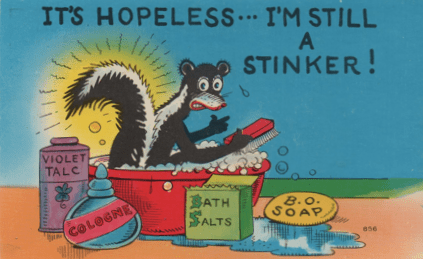 What’s interesting about these postcards from the Fifties is that this was a time when the word “stink” was largely taboo in the movies or on radio. We were a little more liberal when it came to print media.