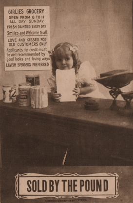 No, we speak here of children by themselves or in pairs, dressed to impress and to serve as enticers for the person looking for the postcard rack for something to send Cousin Mehitable. (Which do you like better: his buttons or her parasol?)