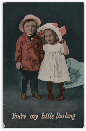 We speak here not of the rppc, where Dad would take pictures of the kids in their new Sunday-go-to-meeting garb; we mean commercial postcard publishers who showed us children dressed up. And we don’t mean babies, because babies are a whole nother subject.